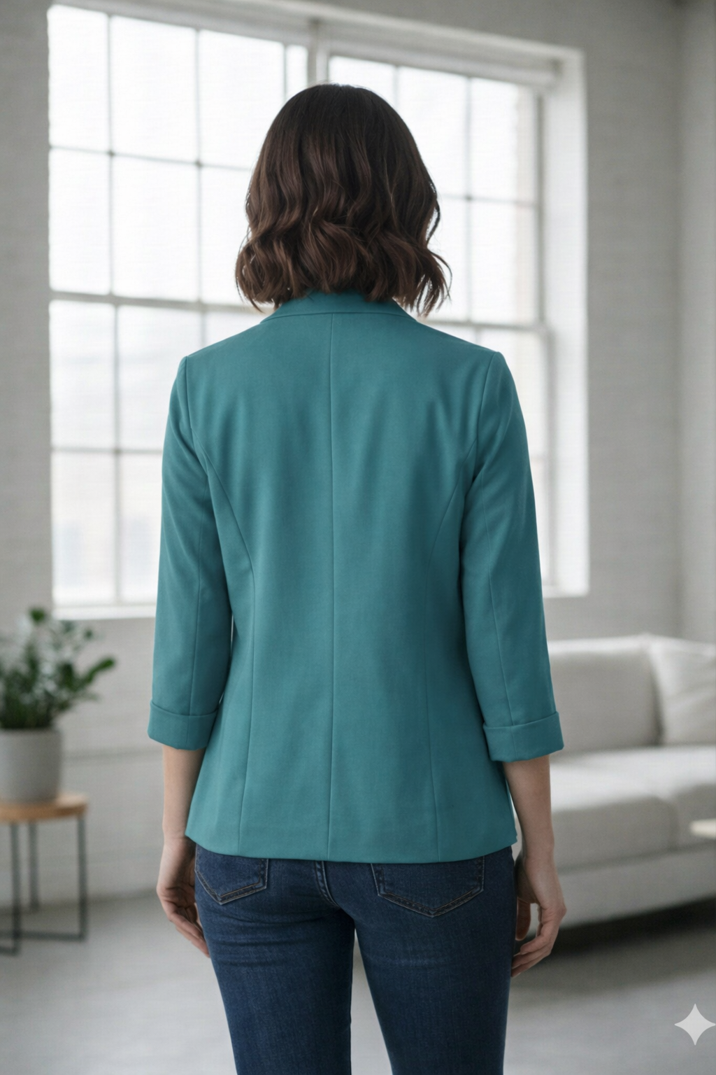 • Back view of a women’s teal blazer with a tailored fit, ideal for smart casual and office wear.